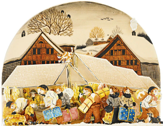 クリスマスマーケットと、春:生命の誕生に活気付く村の生活を描いた2枚は原寸大でご覧ください。 Museum Appenzell所蔵 1900年代半ばの作品