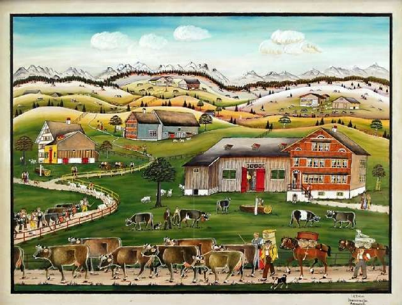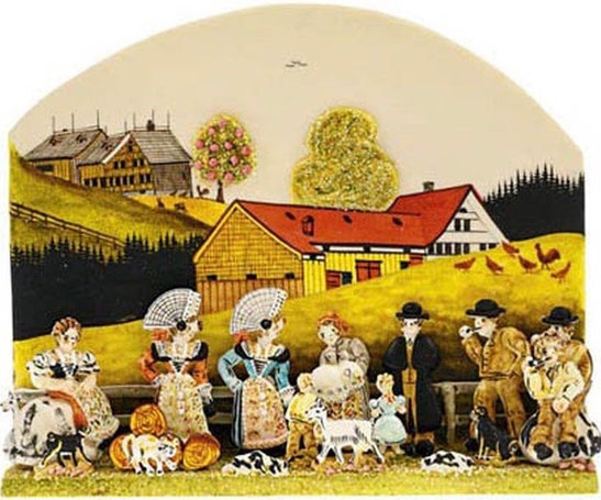 アッペンツェルは古くから牧畜が盛んで、人々が、日々の営みの合間にチーズの木箱やミルクの樽蓋に生活シーンを題材にした絵を描いてきた農民画『Senntumsmalerei セントウムス マーレライ』の伝統があり、現存する最も古いものは16世紀に遡るそう。