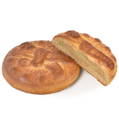 直径30cm、重量300gほどの円形で、高さ約3~4cm に焼き上げられ、ペーストなどの詰め物をせず、表面にフォークで線を描いて仕上げるのが定番スタイル