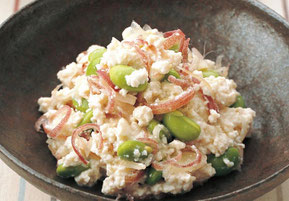 ④ ②ボウルの豆腐に茗荷、生姜、枝豆を加えて和えましょう。